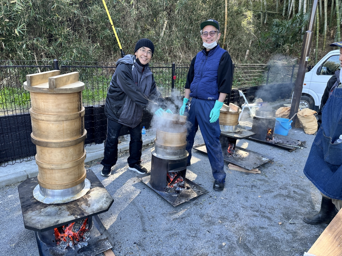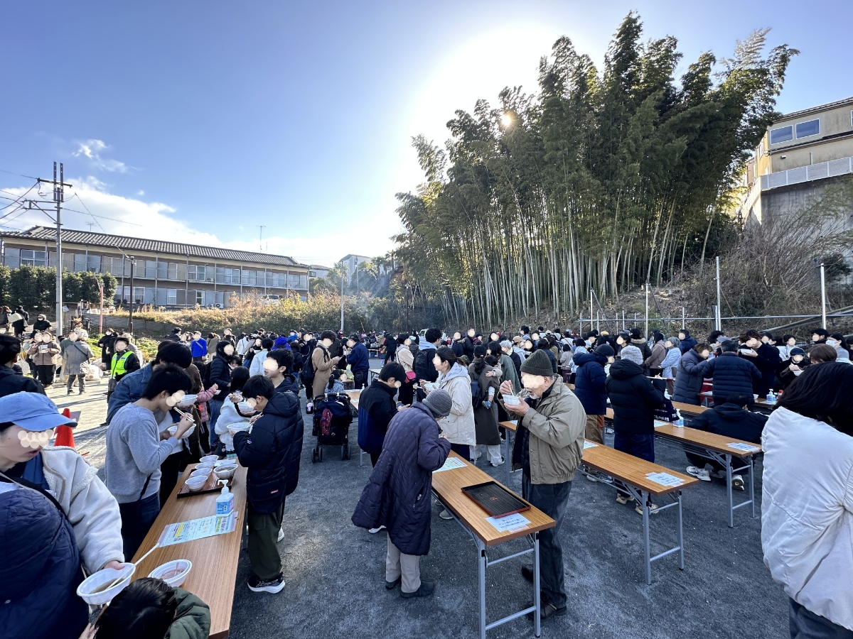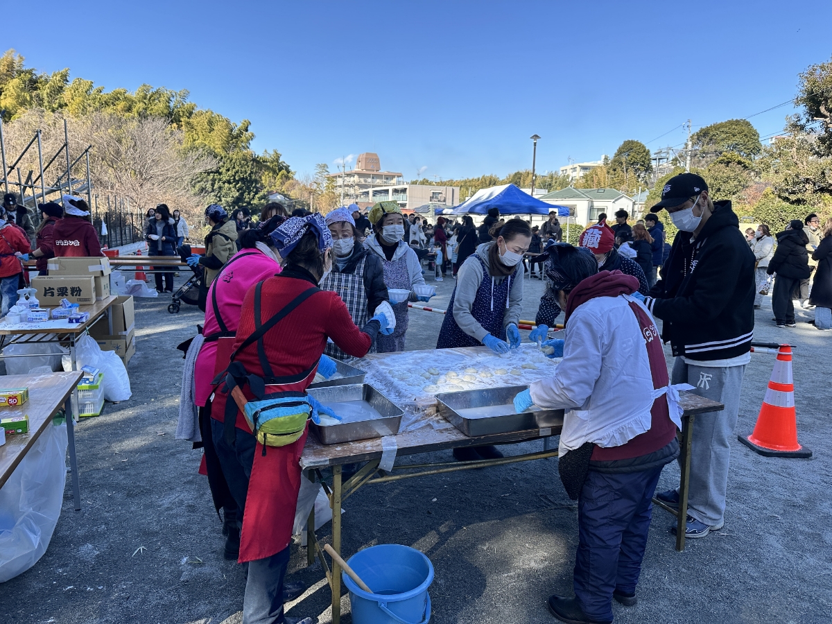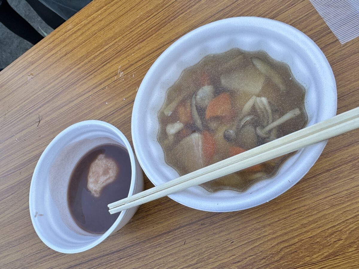 券を携えて列に並びます。皆さんが美味しそうにお餅を頬張っているのを横目に見て。順番が来ると「おしることお雑煮一つずつ!」元気な声とともにお椀が配られました。「いただきます!」つきたてのお餅はきめが細かくて軟らかく、お雑煮は具にも味が染みて寒い冬には最高でした。