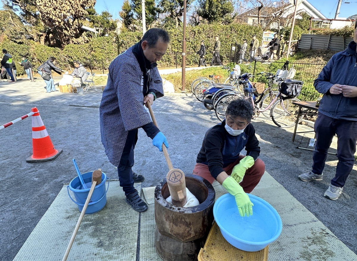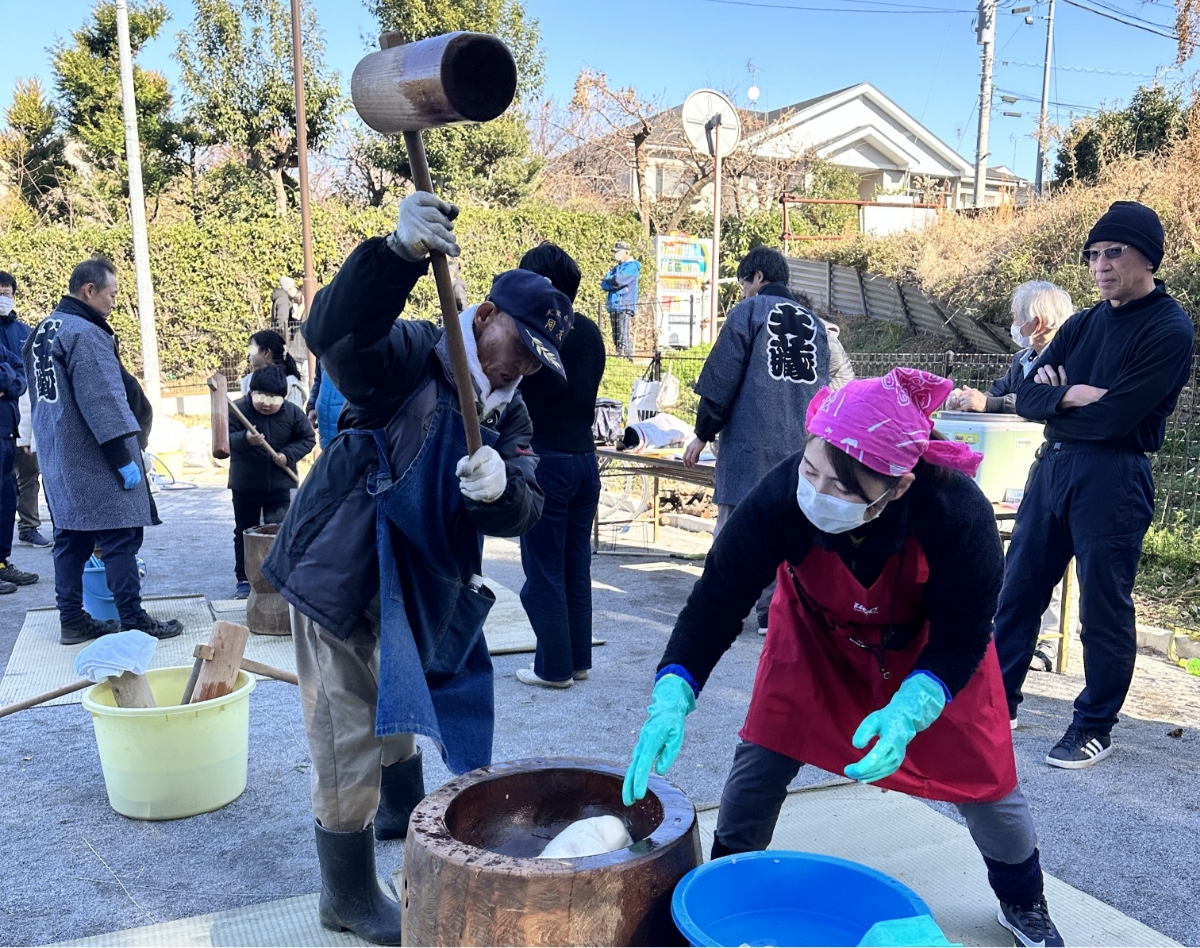 お腹もいっぱいになったところで、ぺったんぺったん音がしている餅つきの方へ。大きな杵を振り上げていたのは、米寿になる小泉さん。「昔の餅つきは12時間、ずっと餅をついていたんだよ」と教えてくれました。さすがベテラン、年季が違います。