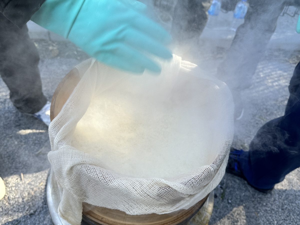 もち米は70キロ。一臼で2升のお餅をつくそうです。蒸したもち米を一度餅つき機でこねてから、仕上げに臼でつきます。最後に臼でつく仕上げがあるかないかで餅の舌触りが段違いに美味しくなるそうです。